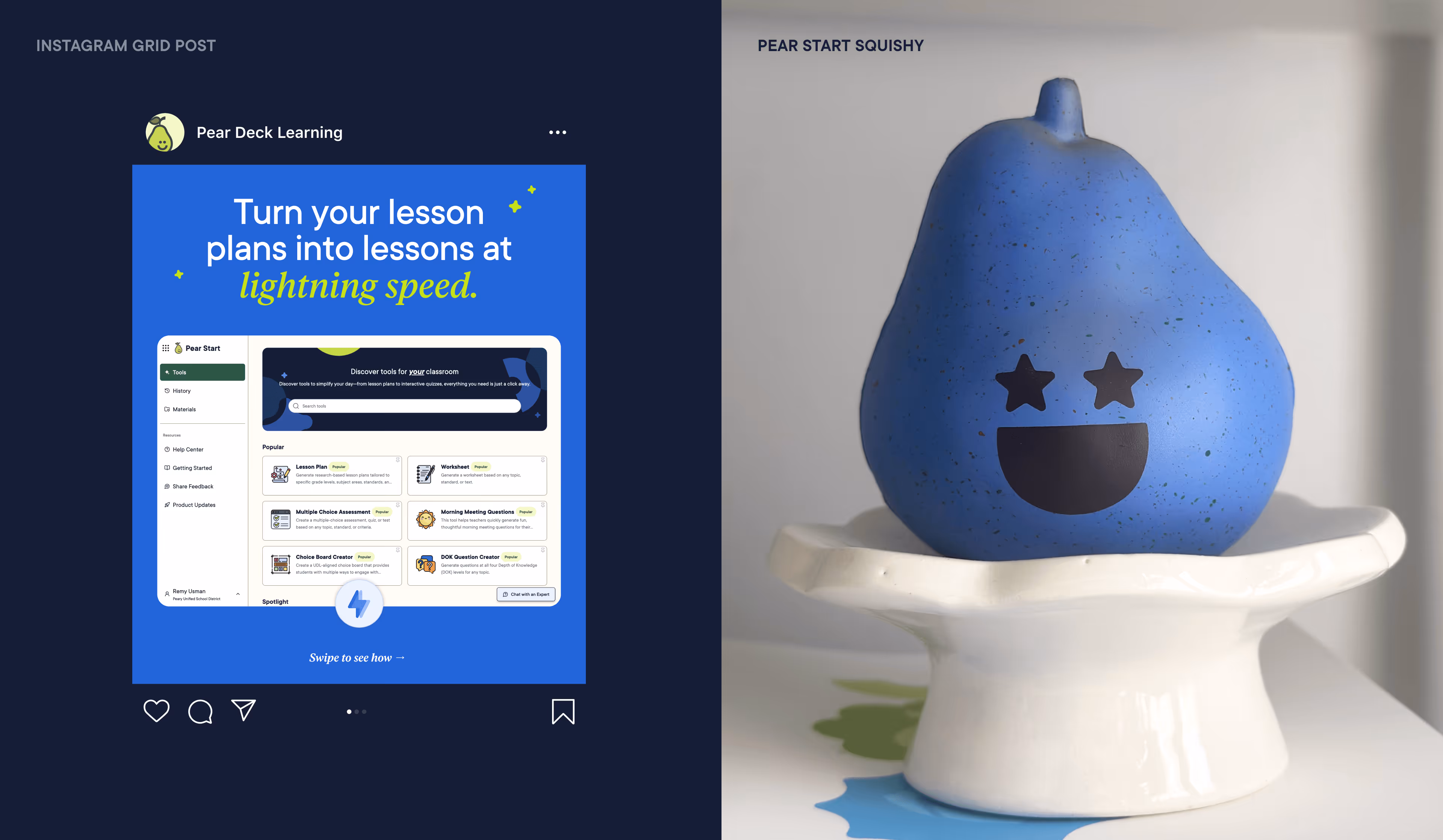 As Pear Deck Learning’s first AI-driven product, Pear Start launched with a new sub-brand designed to stand on its own while staying rooted in the parent brand. To strike that balance, we expanded the palette with cornflower blue, a bright and optimistic hue built to play off the signature kiwi while signaling innovation and speed. Applied across web, social, and digital touchpoints, these elements form a distinct visual system that makes Pear Start immediately recognizable within the broader brand.